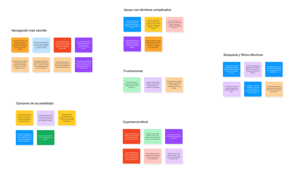 Ahora que conseguí información de los usuarios y los portales similares, creé un mapa de afinidad para descubrir los problemas más comunes que encontré. Este mapa fue clave para guiar el rediseño del PREP.
