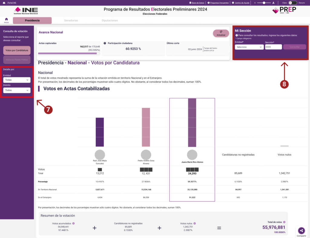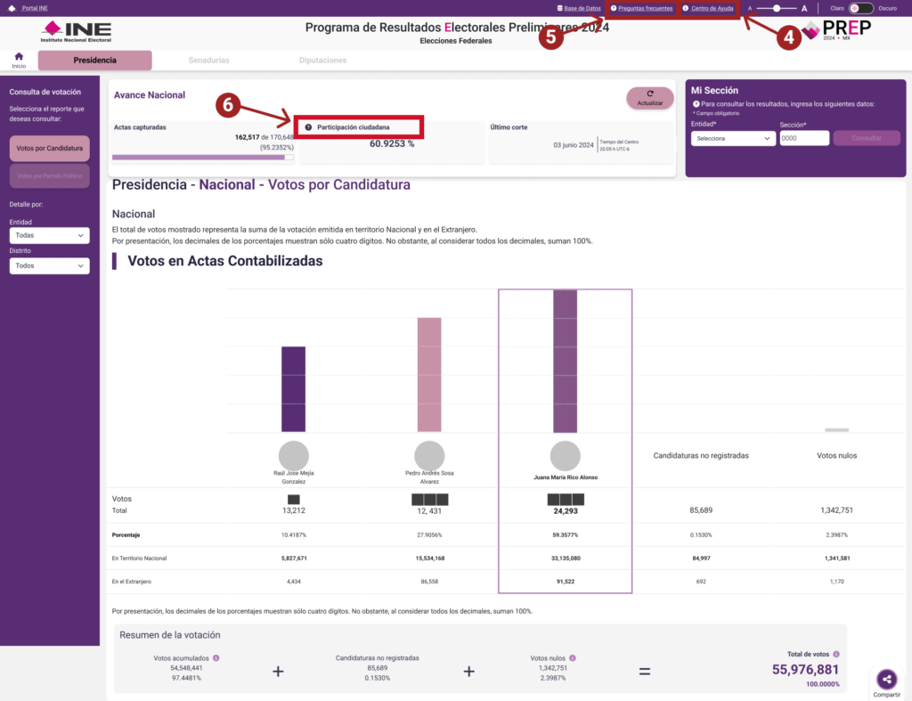 2) Menú lateral organizado y accesible: Muestra opciones claras y organizadas como “Votos por Candidatura” y “Votos por Partido Político”, lo que permite a los usuarios seleccionar rápidamente el tipo de información que desean consultar.